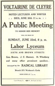 - ^ a b c d e f Goldman, Emma. "Voltairine De Cleyre" (PDF). The Emma Goldman Papers. University of California, Berkeley. Retrieved August 28, 2013.