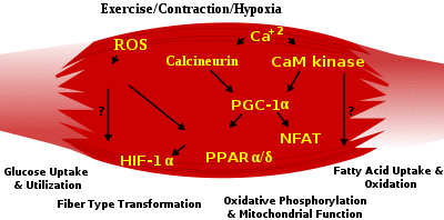Contraction-induced changes in intracellular calcium or reactive oxygen species provide signals to diverse pathways that include the MAPKs, calcineurin and calcium/calmodulin-dependent protein kinase IV to activate transcription factors that regulate gene expression and enzyme activity in skeletal muscle.