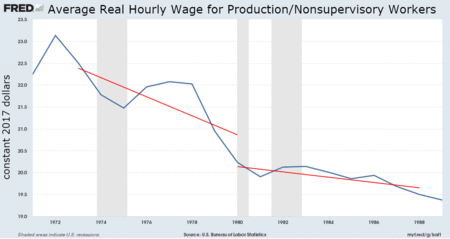 The average real hourly wage for production and nonsupervisory workers continued the decline that had begun in 1973, albeit at a slower rate, and remained below the pre-Reagan level in every Reagan year.[54]