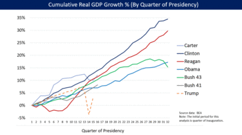 Real GDP grew over one-third during Reagan's presidency, an over $2 trillion increase. The compound annual growth rate of GDP was 3.6% during Reagan's eight years, compared to 2.7% during the preceding eight years.[59] Real GDP per capita grew 2.6% under Reagan, compared to 1.9% average growth during the preceding eight years.[60]
