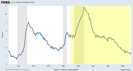 The unemployment rate averaged 7.5% under Reagan, compared to an average 6.6% during the preceding eight years. Declining steadily after December 1982, the rate was 5.4% the month Reagan left office.[53]