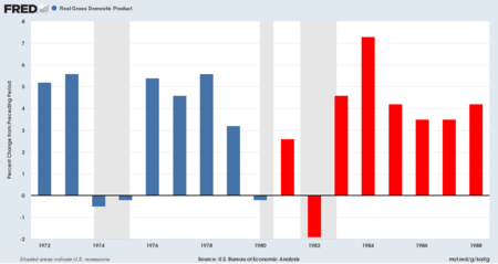 - Total federal outlays averaged of 21.8% of GDP from 1981–88, versus the 1974–1980 average of 20.1% of GDP. This was the highest of any President from Carter through Obama.[82]