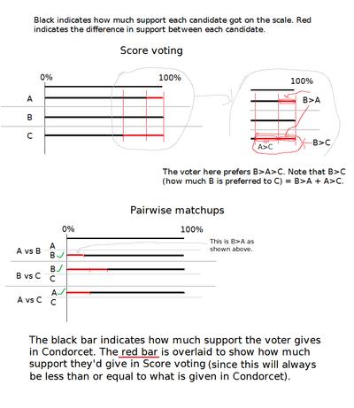 - ^ In this example, the available scores are 0–6, and each voter normalizes their max/min scores to this range, while selecting a score for the middle that is proportional to distance.