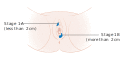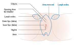 Surgery is a mainstay of therapy depending on anatomical staging and is usually reserved for cancers that have not spread beyond the vulva.[31] Surgery may involve a wide local excision (excision of the tumor with a safety-margin of healthy tissue, that ensures complete removal of the tumor), radical partial vulvectomy, or radical complete vulvectomy with removal of vulvar tissue, inguinal and femoral lymph nodes.[22][27] In cases of early vulvar cancer, the surgery may be less extensive and consist of wide excision or a simple vulvectomy. Surgery is significantly more extensive when the cancer has spread to nearby organs such as the urethra, vagina, or rectum. Complications of surgery include wound infection, sexual dysfunction, edema and thrombosis, as well as lymphedema secondary to dissected lymph nodes.[33]