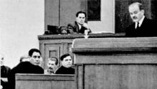 At the 19th Party Congress in 1952, Molotov was elected to the replacement for the Politburo, the Presidium, but was not listed among the members of the newly established secret body known as the Bureau of the Presidium; indicating that he had fallen out of Stalin's favour.[60] At the 19th Congress, Molotov and Anastas Mikoyan were said by Stalin to have committed grave mistakes, including the publication of a wartime speech by Winston Churchill favourable to the Soviet Union's wartime efforts.[61] Both Molotov and Mikoyan were falling out of favour rapidly, with Stalin telling Beria, Khrushchev, Malenkov and Nikolai Bulganin that he did not want to see Molotov and Mikoyan around anymore. At his 73rd birthday, Stalin treated both with disgust.[62] In his speech to the 20th Party Congress in 1956, Khrushchev told delegates that Stalin had had plans for "finishing off" Molotov and Mikoyan in the aftermath of the 19th Congress.[63]