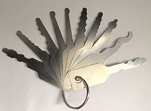 Most wafer tumbler locks with poor tolerances can be opened with a set of jigglers or try-out keys. These sets of keys are designed with the most common patterns of key available. The key is inserted into the lock like a normal key, and a turning force is applied whilst the key is raked back and forth until the lock opens.