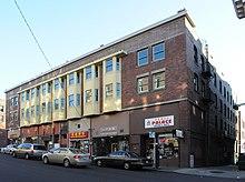 The Louisa Hotel was designed in 1909 by Willatzen & Byrne as the Nelson, Tagholm, and Jensen Building (named after the investors) at 665 South King Street, on the block bounded by 7th Avenue South and Maynard Alley South.[2] Paul Woo purchased the building in 1963 for US$160,000 (equivalent to $1,340,000 in 2019).[3] It functioned as a single room occupancy hotel (SRO) with street-level spaces for shops and restaurants until 1970, when a string of deadly fires led to tightened building codes; unable to comply, the second and third floor residential spaces were closed.[2][4] The street-level businesses continued, including a pet shop and Mon Hei Bakery, the first Chinese bakery in Seattle.[2][3][4]