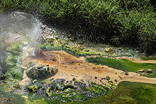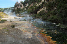 The valley's botanically-rich ecosystem now includes close to 50 different tree and shrub species, around 50 ferns and allied plants and many herbaceous plants and grasses.[14] Notable species include kanuka adapting a prostrate habit on account of the warm soil temperatures, arching clubmoss capable of growing in soil temperatures of over 50 °C (122 °F),[15] and large populations of threatened fern species. Some of the plants are frost-intolerant and are restricted to hydrothermal areas in New Zealand. Different species of bacteria, such as Chloroflexus, co-exist with blue-green algae in the beds of hot water streams in the valley, in particular the overflow stream from Frying Pan Lake. The algae and bacteria form carpets of vivid hues ranging from orange to bright green and blue depending on water temperature and sulphur concentration. The margins of these streams are often populated by mosses and ferns.