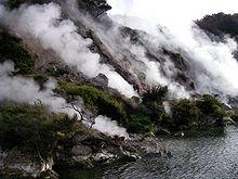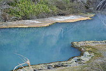 The Waimangu Volcanic Rift Valley is the hydrothermal system created on 10 June 1886 by the volcanic eruption of Mount Tarawera, on the North Island of New Zealand. It encompasses Lake Rotomahana, the site of the Pink and White Terraces, as well as the location of the Waimangu Geyser, which was active from 1900 to 1904.[1][2] The area has been increasingly accessible as a tourist attraction and contains Frying Pan Lake, which is the largest hot spring in the world,[3] and the steaming and usually pale blue Inferno Crater Lake, the largest geyser-like feature in the world although the geyser itself cannot be seen since it plays at the bottom of the lake.[4]
