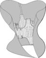 A pseudo-ribbon corset looks like a ribbon corset but is made from cut cloth instead of ribbons. The outside seam of the cut cloth is sewn fine, while the tight inside seam is sewn plain and curved.[3]