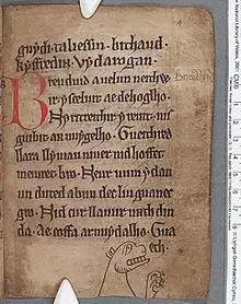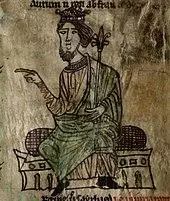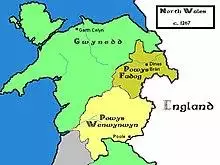 From 800 onwards, a series of dynastic marriages led to Rhodri Mawr's (r. 844–77) inheritance of Gwynedd and Powys. His sons founded the three dynasties of (Aberffraw for Gwynedd, Dinefwr for Deheubarth and Mathrafal for Powys). Rhodri's grandson Hywel Dda (r. 900–50) founded Deheubarth out of his maternal and paternal inheritances of Dyfed and Seisyllwg in 930, ousted the Aberffraw dynasty from Gwynedd and Powys and then codified Welsh law in the 940s.[57] Maredudd ab Owain (r. 986–99) of Deheubarth, (Hywel's grandson), temporarily ousted the Aberffraw line from control of Gwynedd and Powys. Maredudd's great-grandson (through his daughter Princess Angharad) Gruffydd ap Llywelyn (r. 1039–63) conquered his cousins' realms from his base in Powys, and extended his authority into England. John Davies states that Gruffydd was "the only Welsh king ever to rule over the entire territory of Wales... Thus, from about 1057 until his death in 1063, the whole of Wales recognised the kingship of Gruffydd ap Llywelyn. For about seven brief years, Wales was one, under one ruler, a feat with neither precedent nor successor."[2] Owain Gwynedd (1100–70) of the Aberffraw line was the first Welsh ruler to use the title princeps Wallensium (prince of the Welsh), a title of substance given his victory on the Berwyn Mountains, according to John Davies.[58]