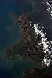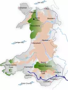 Wales has been inhabited by modern humans for at least 29,000 years.[21] Continuous human habitation dates from the end of the last ice age, between 12,000 and 10,000 years before present (BP), when Mesolithic hunter-gatherers from central Europe began to migrate to Great Britain. At that time sea levels were much lower than today. Wales was free of glaciers by about 10,250 BP, the warmer climate allowing the area to become heavily wooded. The post-glacial rise in sea level separated Wales and Ireland, forming the Irish Sea. By 8,000 BP the British Peninsula had become an island.[22][23] By the beginning of the Neolithic (c. 6,000 BP) sea levels in the Bristol Channel were still about 33 feet (10 metres) lower than today.[24][25][26] The historian John Davies theorised that the story of Cantre'r Gwaelod's drowning and tales in the Mabinogion, of the waters between Wales and Ireland being narrower and shallower, may be distant folk memories of this time.[27]