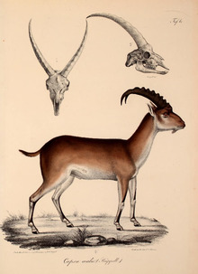 The walia ibex (Capra walie, Ge'ez: ዋልያ wālyā) is an endangered species of ibex. It is sometimes considered a subspecies of the Alpine ibex. Threats against the species include habitat loss, poaching, and restricted range; only about 500 individuals survived in the mountains of Ethiopia, concentrated in the Semien Mountains, largely due to past poaching and habitat depletion.[2] If the population were to increase, the surrounding mountain habitat would be sufficient to sustain only 2,000 ibex. The adult walia ibex's only known wild predator is the hyena. However, young ibex are often hunted by a variety of fox and cat species. The ibex are members of the goat family, and the walia ibex is the southernmost of today's ibexes. In the late 1990s, the walia ibex went from endangered to critically endangered due to the declining population. The walia ibex is also known as the Abyssinian ibex.[3][4]