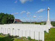 On 11 October 1918, during the Hundred Days Offensive, the 4th Brigade was supporting the 6th Infantry Brigade in an attack on the German-held village of Iwuy, north east of Cambrai in France. Aware that German soldiers were bringing up more machine-guns, Algie led a group of volunteers past the battalion's designated area of operations and captured two machine-guns, which were brought to bear on the Germans. In doing so he secured the east end of Iwuy and returned to his lines for reinforcements. He was killed when leading them back to the area under the control of his men. His actions on 11 October contributed to the capture of the entire village later that day, for which he was posthumously awarded the Victoria Cross (VC).[1] The VC, instituted in 1856, was the highest award for valour that could be bestowed on a soldier of the British Empire.[3] The citation that was published in the London Gazette for his VC read: