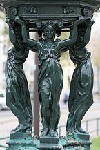 Wallace Fountains are public drinking fountains roughly designed by Sir Richard Wallace and sculpted by Charles-Auguste Lebourg. They are large cast-iron sculptures scattered throughout the city of Paris, France, mainly along the most-frequented sidewalks. They are named after the Englishman Richard Wallace, who financed their construction. A great aesthetic success, they are recognized worldwide as one of the symbols of Paris. A Wallace Fountain can be seen outside the Wallace Collection in London, the gallery that houses the works of art collected by Sir Richard Wallace and the first four Marquesses of Hertford.