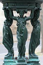 The large model was conceived by Sir Richard Wallace, and was inspired by the Fontaine des Innocents. On a foundation of Hauteville stone rests an octagonal pedestal on which four caryatids are affixed with their backs turned and their arms supporting a pointed dome decorated by dolphins.