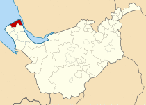 Wallasey is situated at the north-east of the Wirral Peninsula, on the western side of the River Mersey and adjoining the Irish Sea. The area is approximately 9.5 km (5.9 mi) east-north-east of the Dee Estuary at Hoylake. Wallasey is at an elevation of between 0–50 m (0–164 ft) above sea level, with the highest point being around St Peter and St Paul's Church in New Brighton.[12]