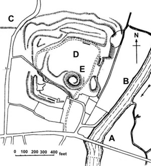 As an important regional town, overlooking a key crossing point on the River Thames, prosperous and with its own mint, the town of Wallingford had been defended by an Anglo-Saxon burgh, or town wall, prior to the Norman invasion of 1066.[2] Wigod of Wallingford, who controlled the town, supported William the Conqueror's invasion and entertained the king when he arrived in Wallingford.[3] Immediately after the end of the initial invasion, the king set about establishing control over the Thames Valley through constructing three key castles, the royal castles of Windsor and Wallingford, and the baronial castle, later transferred to royal hands, built at Oxford.[4]