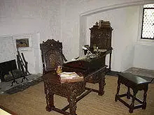 While imprisoned in the Tower, Raleigh wrote his incomplete The Historie of the World.[37] Using a wide array of sources in six languages, Raleigh was fully abreast of the latest continental scholarship. He wrote not about England, but of the ancient world with a heavy emphasis on geography. Despite his intention of providing current advice to the King of England, King James I complained that it was "too sawcie in censuring Princes".[38][39] Raleigh remained imprisoned in the Tower until 1616.[40] His son, Carew, was conceived and born (in 1604 or 1605) while Raleigh was imprisoned in the Tower.[41]