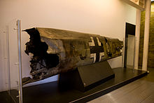 Two sections of the fuselage of the aircraft were initially hidden by David McLean and later retrieved. One part was sold to the former assistant secretary of the Battle of Britain Association, who gave it to a war museum in the US; this 17.5 by 23 inches (44 by 58 cm) part was later sold by Bonhams at auction.[108] Part of the fuel tank and a strut were offered for sale via Bonhams in 2014.[109] Other wreckage was salvaged by 63 Maintenance Unit between 11 and 16 May 1941 and then taken to Oxford to be stored. The aeroplane had been armed with four machine guns in the nose, but carried no ammunition.[110] One of the engines is on display at the RAF Museum while the Imperial War Museum displays another engine and part of the fuselage.[111]