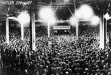 Meanwhile, problems continued with the economy; hyperinflation caused many personal fortunes to be rendered worthless. When the German government failed to meet its reparations payments and French troops marched in to occupy the industrial areas along the Ruhr in January 1923, widespread civil unrest was the result.[30] Hitler decided the time was ripe to attempt to seize control of the government with a coup d'état modelled on Benito Mussolini's 1922 March on Rome.[31] Hess was with Hitler on the night of 8 November 1923 when he and the SA stormed a public meeting organised by Bavaria's de facto ruler, Staatskommissar (state commissioner) Gustav von Kahr, in the Bürgerbräukeller, a large beer hall in Munich. Brandishing a pistol, Hitler interrupted Kahr's speech and announced that the national revolution had begun, declaring the formation of a new government with World War I General Erich Ludendorff.[32] The next day, Hitler and several thousand supporters attempted to march to the Ministry of War in the city centre. Gunfire broke out between the Nazis and the police; sixteen marchers and four police officers were killed. Hitler was arrested on 11 November.[33][34]