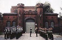 Spandau was placed under the control of the Allied Control Council, the governing body in charge of the military occupation of Germany, which consisted of representatives from the UK, France, the United States, and the Soviet Union. Each country supplied prison guards for a month at a time on a rotating basis. After the inmates were given medical examinations—Hess refused his body search, and had to be held down[142]—they were provided with prison garb and assigned the numbers by which they were addressed throughout their stay. Hess was Number 7. The prison had a small library and inmates were allowed to file special requests for additional reading material. Writing materials were limited; each inmate was allowed four pieces of paper per month for letters. They were not allowed to speak to one another without permission and were expected to work in the facility, helping with cleaning and gardening chores.[143] The inmates were taken for outdoor walks around the prison grounds for an hour each day, separated about 10 yards (9 m) apart. Some of the rules became more relaxed as time went on.[142]