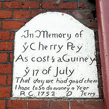 There are various local legends explaining this curious plaque, including a tale of the theft of a cherry pie by local workmen who were caught and fined half a guinea (52.5p). However the most likely explanation is that it was placed there by the landlord of 1752, David Jersey (corrupted by centuries of repainting and re-cutting the inscription to D Jerry on the plaque), commemorating a feast which included a huge cherry pie. Monstrous pies were a feature of 18th-century Essex rural festivals; the Galmpton Gooseberry Pie Fair in Devon is still in existence, and other inns around the edge of Epping Forest were famed for pies (rabbit pie at The Reindeer, Loughton, now Warren House, and pigeon pie at The King's Head, Chigwell). Wanstead was well known for its cherry orchards as late as the 1830s, when they were mentioned by poet Thomas Hood, who lived in Wanstead 1832-5.