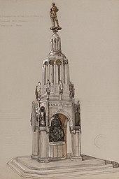 At around 90 feet (27 m) high,[3] the war memorial monument is the most prominent construction in the park. It was designed by local architect T. F. Tickner and £5,000 was raised from a public appeal that commenced in 1924 to fund the building work.[11] It was built in 1927 and dedicated by Field Marshal Douglas Haig on 8 October 1927.[2][4] It is made of Portland stone, and was built by John Gray who also built the Courtaulds works at Foleshill and a number of housing estates. Inside the memorial is a room called the Chamber of Silence which contains the "Roll of the Fallen", a list of all Coventry men killed in the two World Wars and the Gulf War, and is open to the public every year on Remembrance Sunday.[3]
