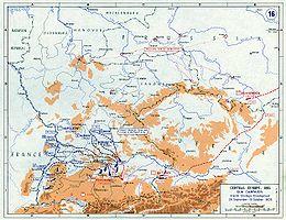 Realizing the danger of his position, Mack decided to go on the offensive. On 8 October, he commanded the army to concentrate around Günzburg and hoped to strike at Napoleon's lines of communication. Mack instructed Kienmayer to draw Napoleon further east towards Munich and Augsburg. Napoleon did not seriously consider the possibility that Mack would cross the Danube and move away from his central base, but he did realize that seizing the bridges at Günzburg would yield a large strategic advantage.[29] To accomplish this objective, Napoleon sent Ney's Corps to Günzburg, completely unaware that the bulk of the Austrian army was heading to the same destination. On 8 October, however, the campaign witnessed its first serious battle at Wertingen between Auffenburg's troops and those of Murat and Lannes.