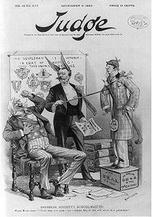 Among the undesirables McAllister endeavored to exclude from the charmed circle of the Four Hundred were the many nouveau riche Midwesterners who poured into New York seeking social recognition. In 1893, McAllister wrote a column about the 1893 World's Columbian Exposition in which he urged that if Chicago society hostesses wanted to be taken seriously, they should hire French chefs and "not frappé their wine too much."[10] The Chicago Journal replied, "The mayor will not frappé his wine too much. He will frappé it just enough so the guests can blow the foam off the tops of the glasses without a vulgar exhibition of lung and lip power. His ham sandwiches, sinkers, and ... pigs' feet, will be triumphs of the gastronomic art."[11][12]