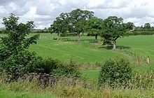 The terrain is flat, with an average elevation of around 55 metres. Much of the area to the south west of the Shropshire Union/A51 is an industrial estate, accessed via Green Lane. The remainder of the parish is predominantly agricultural. The woodland of Hill's Gorse lies in the north east of the parish, and Wardle Covert, part of Long Wood and several smaller areas of woodland are in the west of the parish. Two water bodies lie between Wardle Covert and the Shropshire Union, and numerous small meres and ponds are scattered across the farmland.[20]