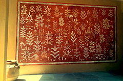 The pared down pictorial language is matched by a rudimentary technique. The ritual paintings are usually done inside the huts. The walls are made of a mixture of branches, earth and cow dung, making a Red Ochre background for the wall paintings. The Warli use only white for their paintings. Their white pigment is a mixture of rice paste and water with gum as a binding. They use a bamboo stick chewed at the end to make it as supple as a paintbrush. The wall paintings are done only for special occasions such as weddings or harvests. The lack of regular artistic activity explains the very crude style of their paintings, which were the preserve of the womenfolk until the late 1970s. But in the 1970s this ritual art took a radical turn, when Jivya Soma Mashe and his son Balu Mashe started to paint, not for any special ritual, but because of his artistic pursuits. Warli painting also featured in Coca-Cola's 'Come home on Diwali' ad campaign in 2010 was a tribute to the spirit of India’s youth and a recognition of the distinct lifestyle of the Warli tribe of Western India.[4]