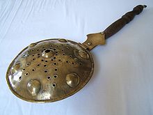 A bed warmer or warming pan was a common household item in countries with cold winters, especially in Europe. It consisted of a metal container, usually fitted with a handle and shaped somewhat like a modern frying pan, with a solid or finely perforated lid. The pan would be filled with embers and placed under the covers of a bed, to warm it up and/or dry it out before use.[1][2]