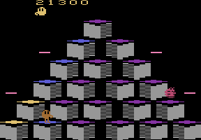 Points are awarded for each color change (25), defeating Coily with a flying disc (500), remaining discs at the end of a stage (at higher stages, 50 or 100) and catching green balls (100) or Slick and Sam (300 each).[4] Bonus points are also awarded for completing a screen, starting at 1,000 for the first screen of Level 1 and increasing by 250 for each subsequent completion, up to 5,000 after Level 4. Extra lives are granted for reaching certain scores, which are set by the machine operator.[5]