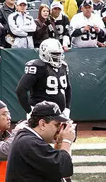 He started all 16 games in his first season in Oakland, splitting time at defensive end and defensive tackle, recording 30 tackles (18 solo) and 2.5 sacks and recovering two fumbles[13] after having lost an estimated 20 pounds before joining the Raiders for the 2004 season.