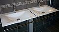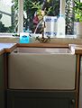 A butler's sink is a rectangular ceramic sink with a rounded rim which is set into a work surface.[3] There are generally two kinds of butler's sinks: The London sink and the Belfast sink.[3] In 2006, both types of sinks usually were 61 centimetres (24 in) across and 46 centimetres (18 in) front-to-back, with a depth of 22.5 centimetres (8.9 in).[4] London sinks were originally shallower than Belfast sinks.[3] (One plumbing guide in 1921 suggested that the Belfast sink was 38 centimetres (15 in) deep.)[5] Some believe this was because London had less access to fresh water (and thus a greater need to conserve water), but this theory is now contested. It is more likely the two sinks had different roles within the household. But that difference usually does not exist in the modern era, and both sinks are now shallow.[3] The primary difference both in the past and today between a Belfast and London sink is that the Belfast sink is fitted with an overflow weir which prevented water from spilling over the sink's edge by draining it away and down into the wastewater plumbing.[6]