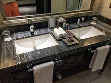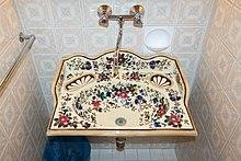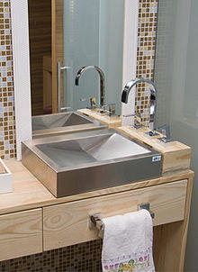 The washstand was a bathroom sink made in the United States in the late 18th century.[1] The washstands were small tables on which were placed a pitcher and a deep bowl, following the English tradition. Sometimes the table had a hole where the large bowl rested, which led to the making of dry sinks. From about 1820 to 1900, the dry sink evolved by the addition of a wooden cabinet with a trough built on the top, lined with zinc or lead.[1] This is where the bowls or buckets for water were kept. Splashboards were sometimes added to the back wall, as well as shelves and drawers, the more elaborate designs usually placed in the kitchen.
