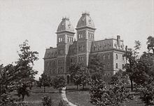 George P. Hays, who had assumed the presidency amid the court battle and the unification controversy, led the newly unified college until 1881.[20] His successor, James D. Moffat, led the college through a period of growth where the college constructed the Old Gym, Hays Hall, Thompson Memorial Library, and Thistle Physics Building, as well as purchasing the land known as the "old fair ground," now used for Cameron Stadium.[21] Towards the end of his term, Moffat personally paid for the 1912 renovations of McMillan Hall.[22] In 1914, Frederick W. Hinitt was elected president. His tenure was dominated by the United States' entry into World War I, with an enrollment drop of 50%.[23] William E. Slemmons, a college trustee and adjunct professor, succeeded Hinitt and served as interim president from May 1918 to June 1919.[24] After the war ended in 1919, Samuel Charles Black took over and helped to stabilize the enrollment.[25] While on a honeymoon tour of national parks, Black became ill and died.[26] His successor, Simon Strousse Baker, was well liked by the college's trustees and by "many a townsman", but the student body felt that Baker was "autocratic" and held an "unfriendly attitude toward the student body as individuals."[25][27] Baker defended himself, saying that the perceived ill-will towards students was unintentional and a misunderstanding.[25] Nonetheless, the student body held a strike and general walkout in 1931, prompting Baker to resign.[25][27]
