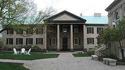 The oldest surviving building is McMillan Hall, which dates to 1793 and is the oldest college building west of the Allegheny Mountains.[95] The main academic building is Old Main, which is topped with two prominent towers.[96] The Old Gym houses a modern exercise facility.[97] McIlvaine Hall, which was originally home to a female seminary, was demolished in 2008 and replaced by the Swanson Science Center.[98][99] Davis Memorial Hall was once a dormitory and private house.[100] The Thistle Physics Building, the Lazear Chemistry Hall, and the Dieter-Porter Life Sciences Building all cater to the scientific curriculum.[36] The Burnett Center and its sister building, the Technology Center, were built in the late 1990s and early 2000s.[101][102]