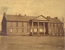Following the Civil War, both colleges were short on students and on funds, causing them to join together as Washington & Jefferson College in 1865.[10] The charter provided for the college to operate at both Canonsburg and Washington, a position that caused significant difficulty for the administration trying to rescue the college amid ill feelings over the unification.[10] Jonathan Edwards, a pastor from Baltimore who had been president of Hanover College, was elected the first president of the unified Washington & Jefferson College on April 4, 1866.[15][16] Edwards immediately encountered significant challenges, including the difficulties of administering a college across two campuses, as well as old prejudices and hard feelings among those still loyal to either Jefferson College or Washington College.[15] Edwards resigned in 1869, as the two-campus arrangement was declared a failure and all operations were consolidated in Washington.[15] Before the merger could be completed, Canonsburg residents and Jefferson College partisans filed a lawsuit, known as the Pennsylvania College Cases, sought to overturn the consolidation plan.[17] Leadership of the college during this time fell to Samuel J. Wilson, a local pastor, and James I. Brownson, who had earlier been interim president of Washington College.[18][19] By 1871, the United States Supreme Court upheld the consolidation, allowing the newly configured college to proceed.[17]