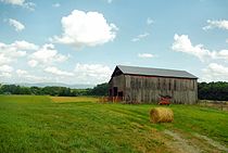 According to the U.S. Census Bureau, the county has a total area of 330 square miles (850 km2), of which 326 square miles (840 km2) is land and 3.3 square miles (8.5 km2) (1.0%) is water.[8] The western portion of the county is situated in the Ridge-and-Valley Appalachians, which are characterized by long, narrow ridges roughly oriented northeast-to-southwest. The county's most prominent Ridge-and-Valley features rise in the vicinity of its northwestern border with Hawkins and Sullivan counties. The eastern portion of the county lies within the Blue Ridge Mountains, specifically the Bald Mountains (south of the Nolichucky River) and the Unaka Range (north of the Nolichucky).[9] Buffalo Mountain, a long ridge that straddles much of Washington's eastern boundary, contains the county's highest point, 3,520-foot (1,070 m) Pinnacle Knob. The Cherokee National Forest protects much of the extreme eastern part of the county. Sampson Mountain, which rises in the southeastern part of the county, is home to a designated national wilderness area.