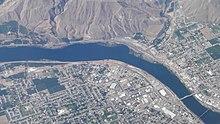 The lanes are rejoined one mile (1.6 km) downriver at the southern city limits of East Wenatchee, from where the highway gradually turns southeast and follows the bank of the Columbia River on the south edge of the Wenatchee plateau.[6] SR 28 passes Pangborn Memorial Airport and the town of Rock Island, where it joins a section of the BNSF Railway's Columbia River Subdivision.[7][8] The highway turns south near the Rock Island Dam, following the river as it winds around Badger Mountain and the Beezley Hills, passing some scattered vineyards and orchards in the canyon.[9] Near Trinidad, SR 28 turns east and leaves the river and railroad, entering Grant County and ascending from Lynch Coulee. At the top of the Babcock Ridge, the highway rejoins the railroad and travels east past more orchards into Quincy. SR 28 passes several data centers on the edge of the city and continues east through downtown as F Street.[10] In downtown Quincy, the highway intersects SR 281, a connecting route that travels south towards a junction with Interstate 90 (I-90) near George.[4][6]