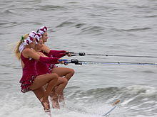 In the United States, there are over 900 sanctioned water ski competitions each summer.[3] Orlando, Florida is considered to be the competitive 3-event waterskiing capital of the world.[30] Competitiv water skiing consists of three events: slalom, jump, and trick.[3][31]