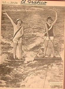 Water skiing gained international attention in the hands of famed promoter, Dick Pope, Sr., often referred to as the "Father of American Water Skiing" and founder of Cypress Gardens in Winter Haven, Florida. Pope cultivated a distinct image for his theme-park, which included countless photographs of the water skiers featured at the park. These photographs began appearing in magazines worldwide in the 1940s and 1950s, helping to bring international attention to the sport for the first time.[27] He was also the first person to complete a jump on water skis, jumping over a wooden ramp in 1928, for a distance of 25 feet.[28] His son, Dick Pope, Jr., is the inventor of bare-foot skiing. Both men are in the Water Ski Hall of Fame. Today, Winter Haven, Florida, with its famous Chain of Lakes, remains an important city for water skiing, with several major ski schools operating there.