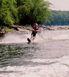 Water skiing (also waterskiing or water-skiing) is a surface water sport in which an individual is pulled behind a boat or a cable ski installation over a body of water, skimming the surface on two skis or one ski. The sport requires sufficient area on a smooth stretch of water, one or two skis, a tow boat with tow rope, two or three people (depending on local boating laws),[1] and a personal flotation device. In addition, the skier must have adequate upper and lower body strength, muscular endurance, and good balance.