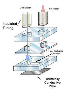 A water block is the watercooling equivalent of a heatsink. It is a type of plate heat exchanger and can be used on many different computer components, including the central processing unit (CPU), GPU, PPU, and Northbridge chipset on the motherboard. It consists of at least two main parts; the "base",which is the area that makes contact with the device being cooled and is usually manufactured from metals with high thermal conductivity such as aluminum or copper. The second part, the "top" ensures the water is contained safely inside the water block and has connections that allow hosing to connect it with the water cooling loop. The top can be made of the same metal as the base, transparent Perspex, Delrin, Nylon, or HDPE. Most newer high-end water blocks also contain mid-plates which serve to add jet tubes, nozzles, and other flow altering devices.