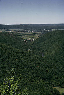 A water gap is a gap that flowing water has carved through a mountain range or mountain ridge and that still carries water today. Such gaps that no longer carry water currents are called wind gaps. Water gaps and wind gaps often offer a practical route for road and rail transport to cross the mountain barrier.
