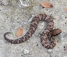 Agkistrodon piscivorus is a species of pit viper in the subfamily Crotalinae of the family Viperidae. It is the world's only semiaquatic viper, and is native to the southeastern United States. It is the only venomous species of North America's water snakes and one of 21 venomous snakes in the United States.[3] As an adult, it is large and capable of delivering a painful and potentially fatal bite. When threatened, it may respond by coiling its body and displaying its fangs.[4] Individuals may bite when feeling threatened or being handled in any way.[5] It occurs in or near water, particularly in slow-moving and shallow lakes, streams, and marshes. It is a strong swimmer and has even been seen swimming in the ocean. However, it is not fully marine, unlike true sea snakes. It has successfully colonized islands off both the Atlantic and Gulf coasts.