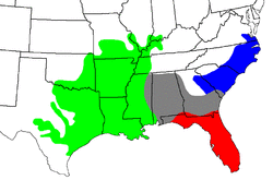 In Georgia, it is found in the southern half of the state up to a few kilometers north of the Fall Line with few exceptions. Its range also includes the Ohio River Valley as far north as southern Indiana, and it inhabits many barrier islands off the coasts of the states where it is found.[16]