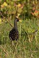 Adult male watercocks are 43 cm (17 in) long and weigh 476–650 g (1.049–1.433 lb).[3] They have mainly black-grey plumage with red legs, bill, extended frontal shield and horn. Young males are buff in colour, darkening as they mature. Their bill is yellow and their legs are green.